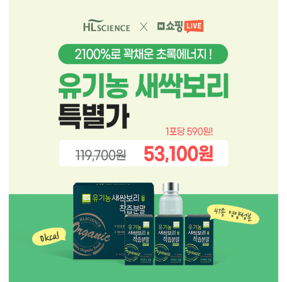 에이치엘사이언스의 "유기농 OOOO 2100% 착즙분말 원데이"는 47종의 영양성분이 포함된 고객감사제 대표선물이다. 라이브 중 구매 시 다양한 혜택이 준비되어있다. OOOO는 무엇일까? (힌트 : ㅅㅆㅂㄹ)