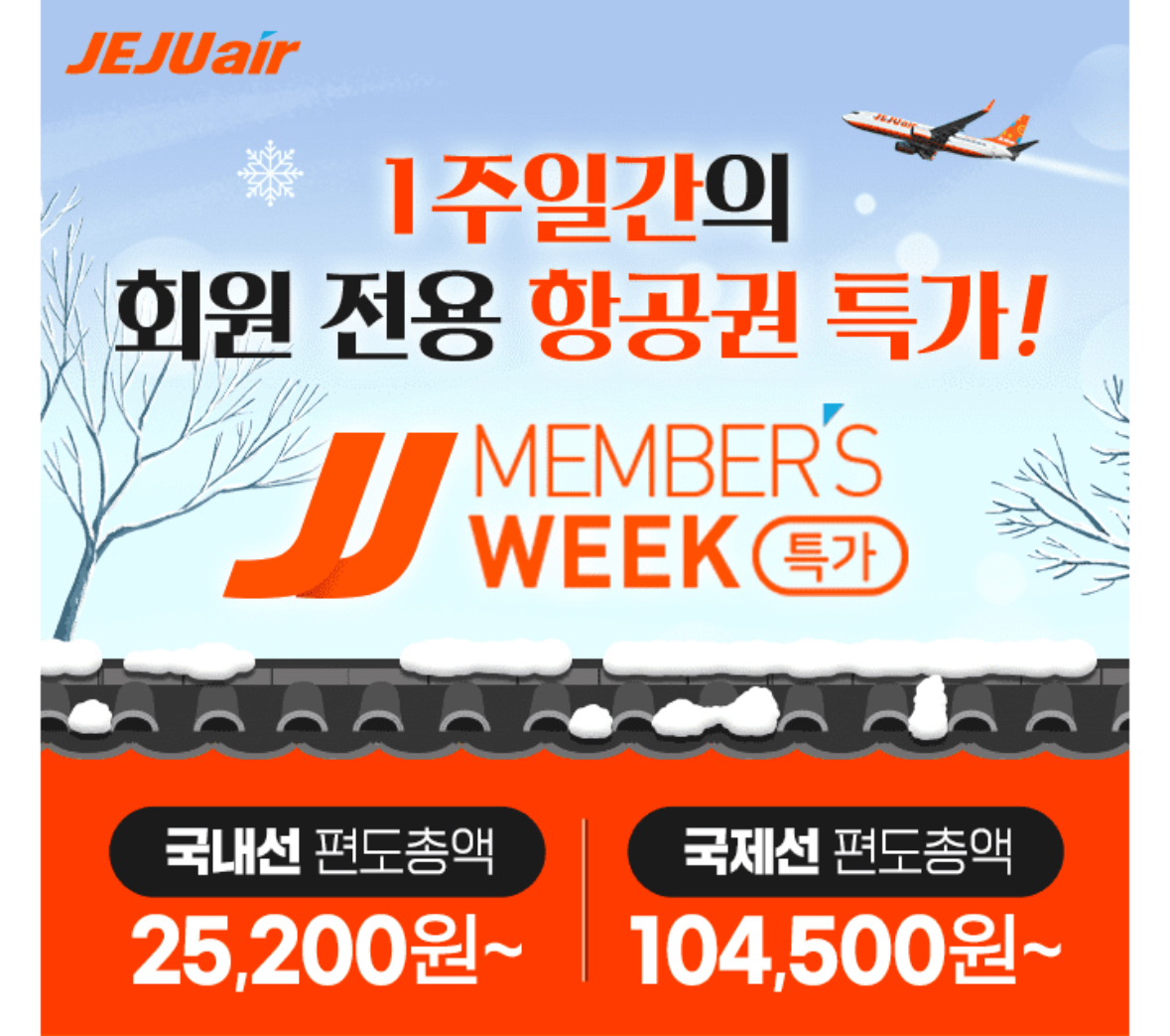 제주항공 회원 전용 겨울 성수기 항공권 특가 편도 국내선 25,200원~, 국제선 104,500원~ 신규취항 노선 달랏까지 특가로 예매 가능한 기회! 제주항공 회원은 특별하니까 최대 OO,OOO원 추가할인까지♥ 아직 회원이 아니라면? 지금 가입하세요! 신규 회원은 최대 7% 중복 할인!