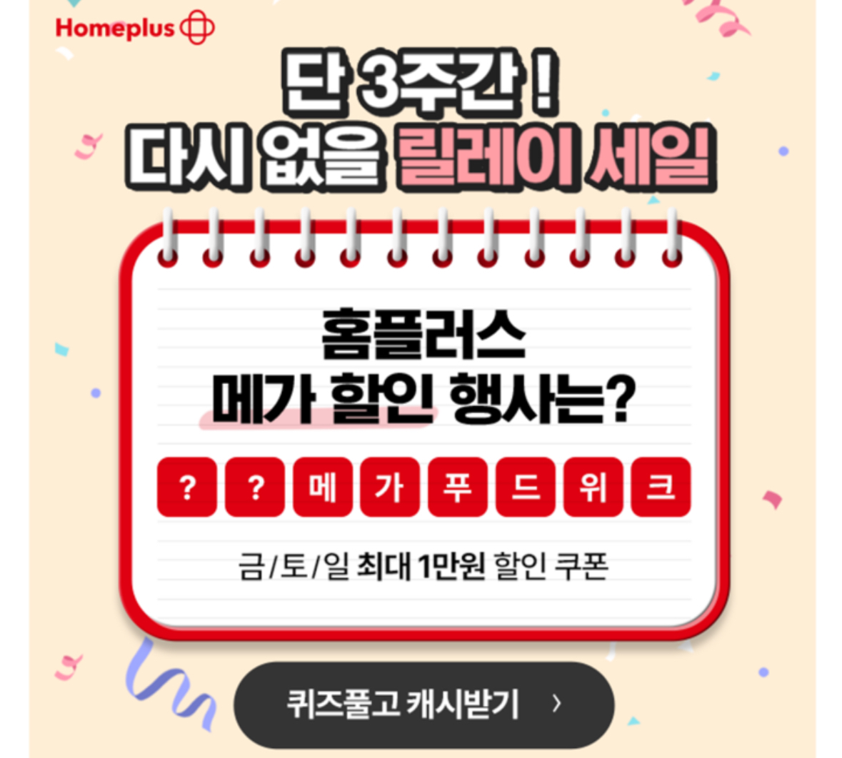단 3주간, 홈플러스에서 진행하는 릴레이 세일 행사 이름은 OO MEGA FOOD WEEK 입니다. 빈 칸에 들어갈 말은 무엇일까요?