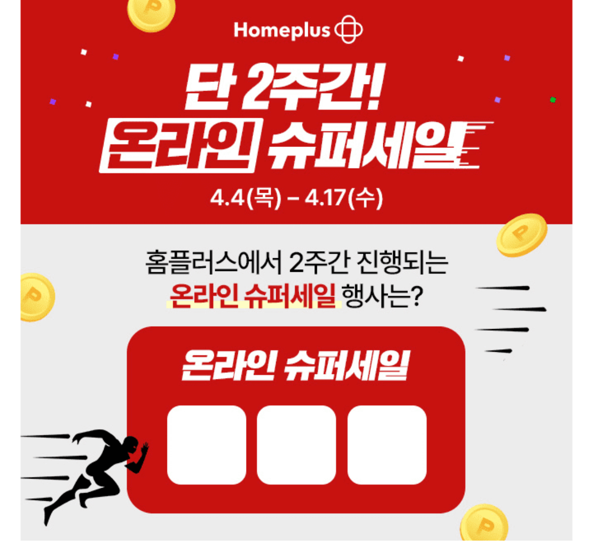 홈플런 슈퍼세일은 4월 O일부터 2주간 진행됩니다.