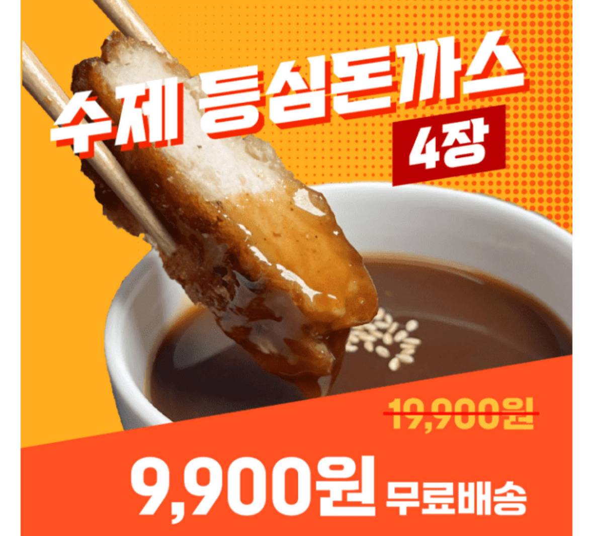진짜 수제 등심돈까스 250g x 2팩(총4장)이 소비자가 19,900원 특가 OOOO원 무료배송 50% 할인으로 진행됩니다. 빈 칸에 들어갈 숫자는 무엇일까요?