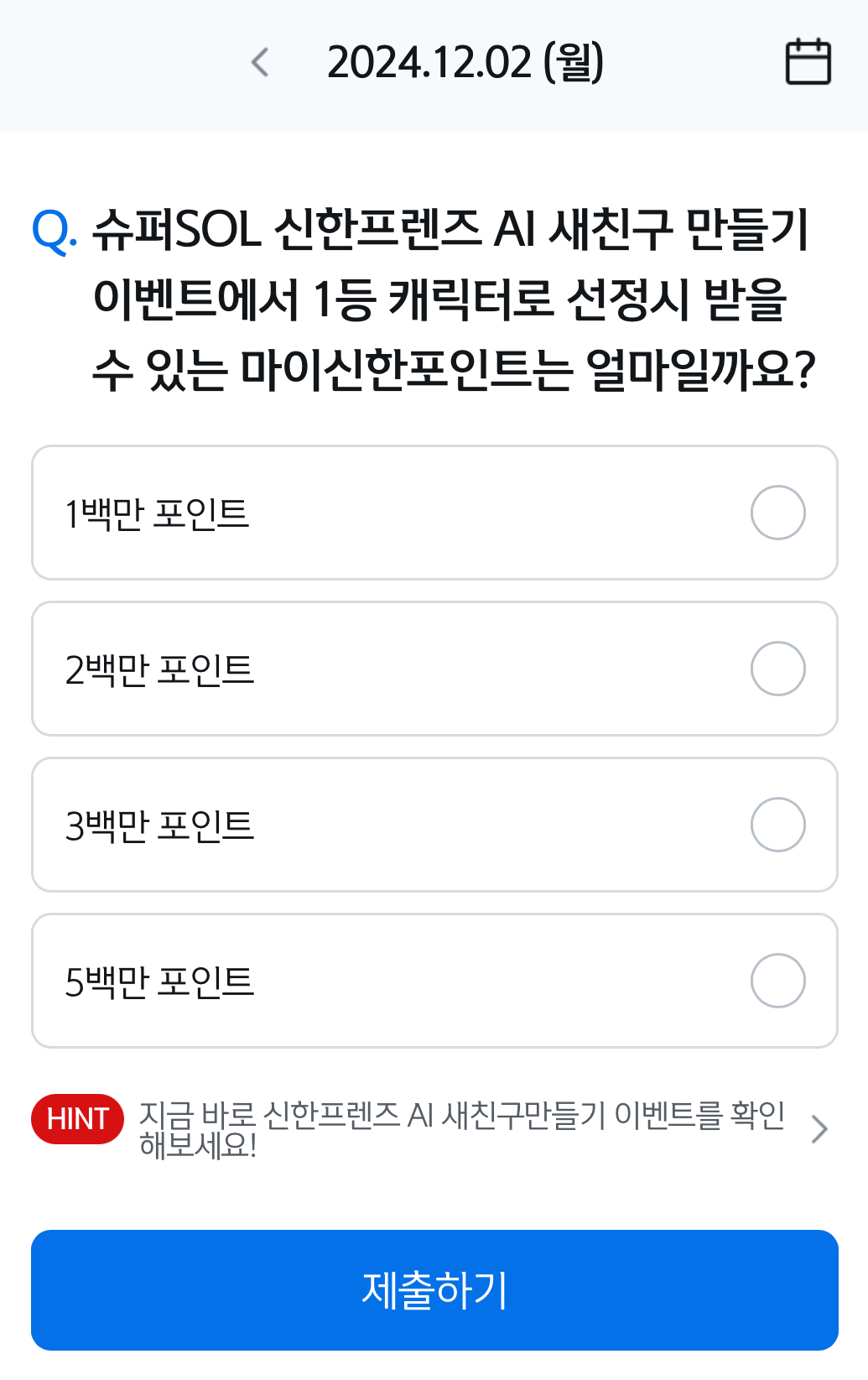 Q. 슈퍼SOL 신한프렌즈 AI 새친구 만들기 이벤트에서 1등 캐릭터로 선정시 받을 수 있는 마이신한포인트는 얼마일까요?